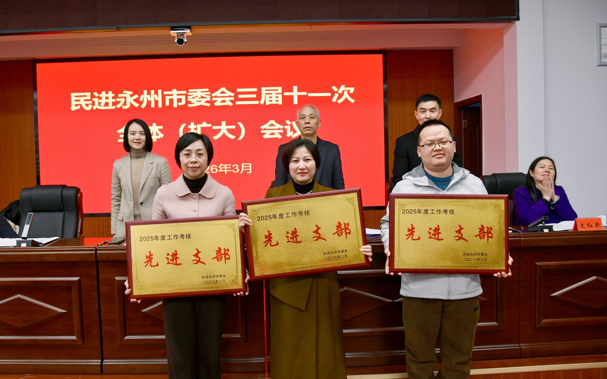 本网讯(通讯员 李小雨 李焕品)3月22日下午,民进永州市委会三届十一次全体(扩大)会议在冷水滩区召开,会议对2025年度会务工作先进集体和个人进行表彰。支部主委何丽萍获社情民意信息工作先进个人,李焕品、李小雨、包红光、王林惠被评为优秀会员,王豪才获得年度贡献奖,学校民进支部获得先进支部荣誉称号。