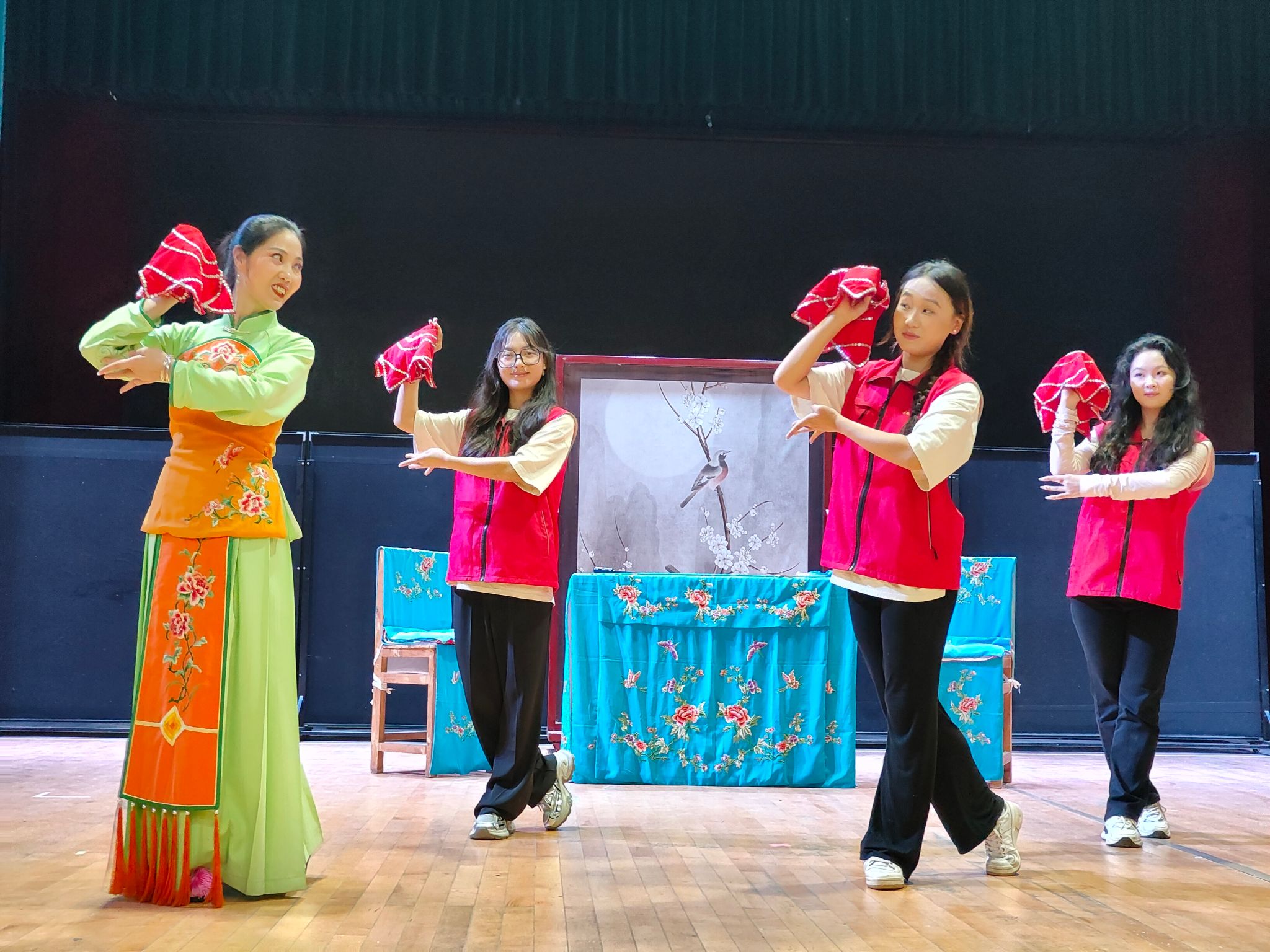为了更好地展现零陵花鼓戏剧种的独特魅力,迎接“三下乡”的大学生队员们,零陵花鼓戏剧团特意安排了经典剧目《假报喜》的带妆排练,在剧团老师们的演绎下,舞手帕、挥纸扇、走碎步等绝招尽情展示,唱功生动、念白清晰无不体现着老师们扎实的基本功。韵律悠扬的音乐,将志愿者们带入精彩的戏曲世界,领略传统文化的魅力。队员们纷纷走上舞台,在剧团老师的指导下,沉浸式体验零陵花鼓戏的内涵。