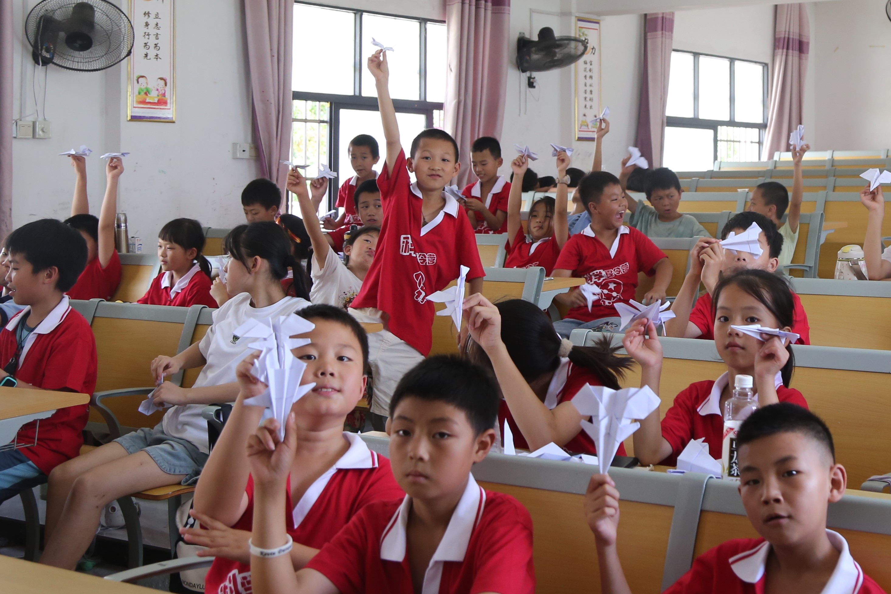 “飞机是如何上天的?”在孩子们求知若渴的眼神中,大学生队员们带领孩子们探索科学的奥秘,亲手触摸我国第五代战机“歼-20”模型机,感受祖国强大的国防力量。在“气球动力车”课堂中,孩子们争先恐后,奋勇争先,看谁做的“车”跑得又快又好。当小苏打和白醋结合,轻松实现“隔空灭火”时,小朋友们直呼精彩!在大学生们的带领下,平平无奇的纸杯,在小朋友手中成为了旋转不用电的“走马灯”。