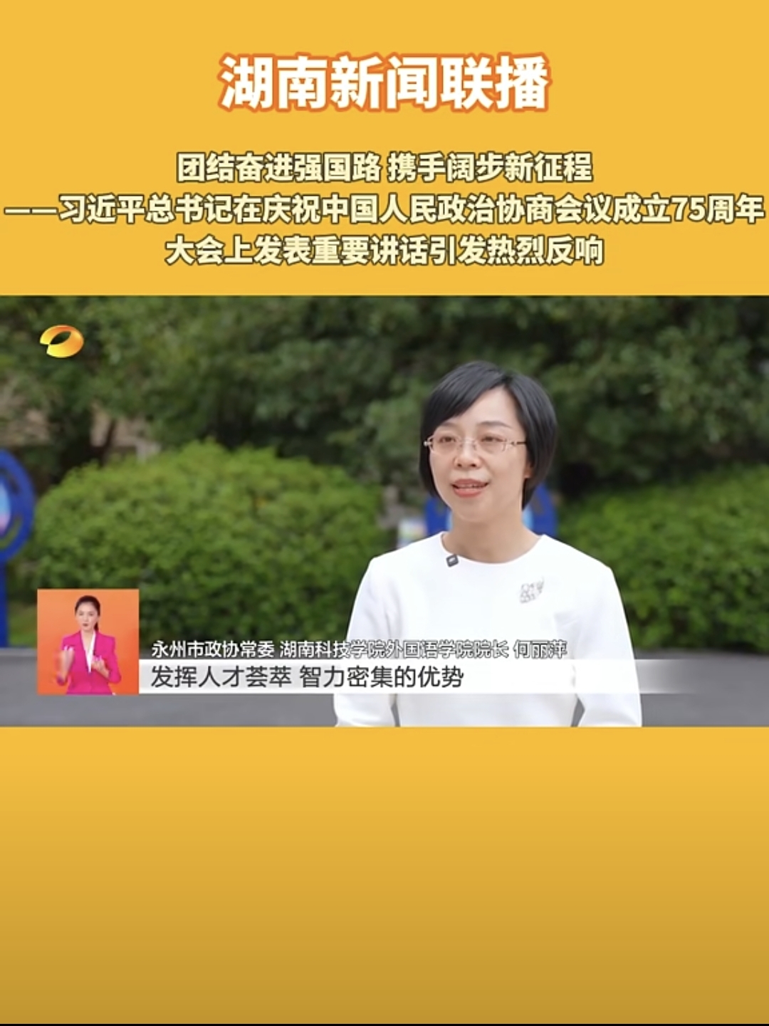 本网讯(通讯员 李焕品)9月20日,湖南卫视新闻联播播出的《团结奋进强国路 携手阔步新征程——习近平在庆祝中国人民政治协商会议成立75周年大会上发表重要讲话,引发热烈反响》节目中,湖南省政协委员、永州市政协常委、我校民进支部主委、外国语学院院长何丽萍在接受采访时讲到:“发挥人才荟萃、智力密集的优势,聚焦推进中国式现代化,进一步全面深化改革,深入推进协商议政。”