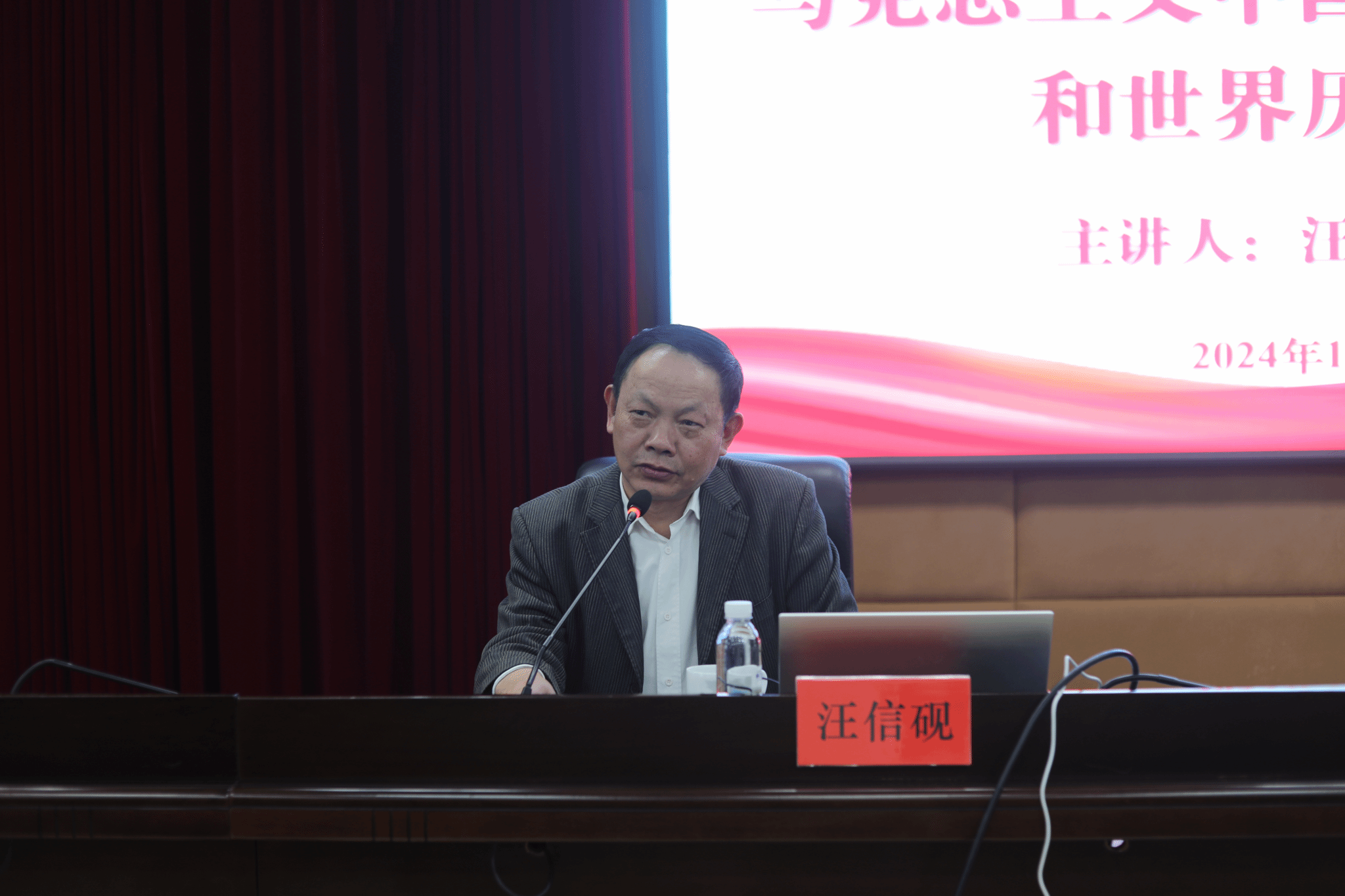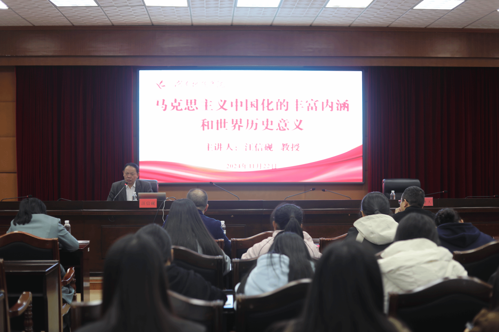 本网讯(通讯员 陈小燕)11月22日,武汉大学人文社会科学资深教授、哲学院教授、博士生导师汪信砚应邀来校,在行政楼801会议室为我校师生作了题为《马克思主义中国化的丰富内涵和世界历史意义》的学术讲座,讲座由党委委员、副校长何海教授主持。