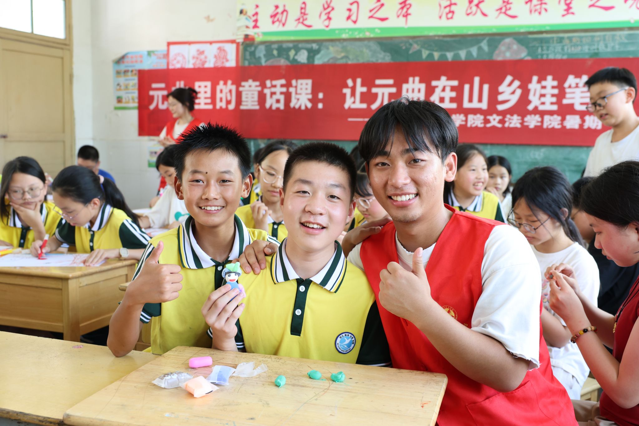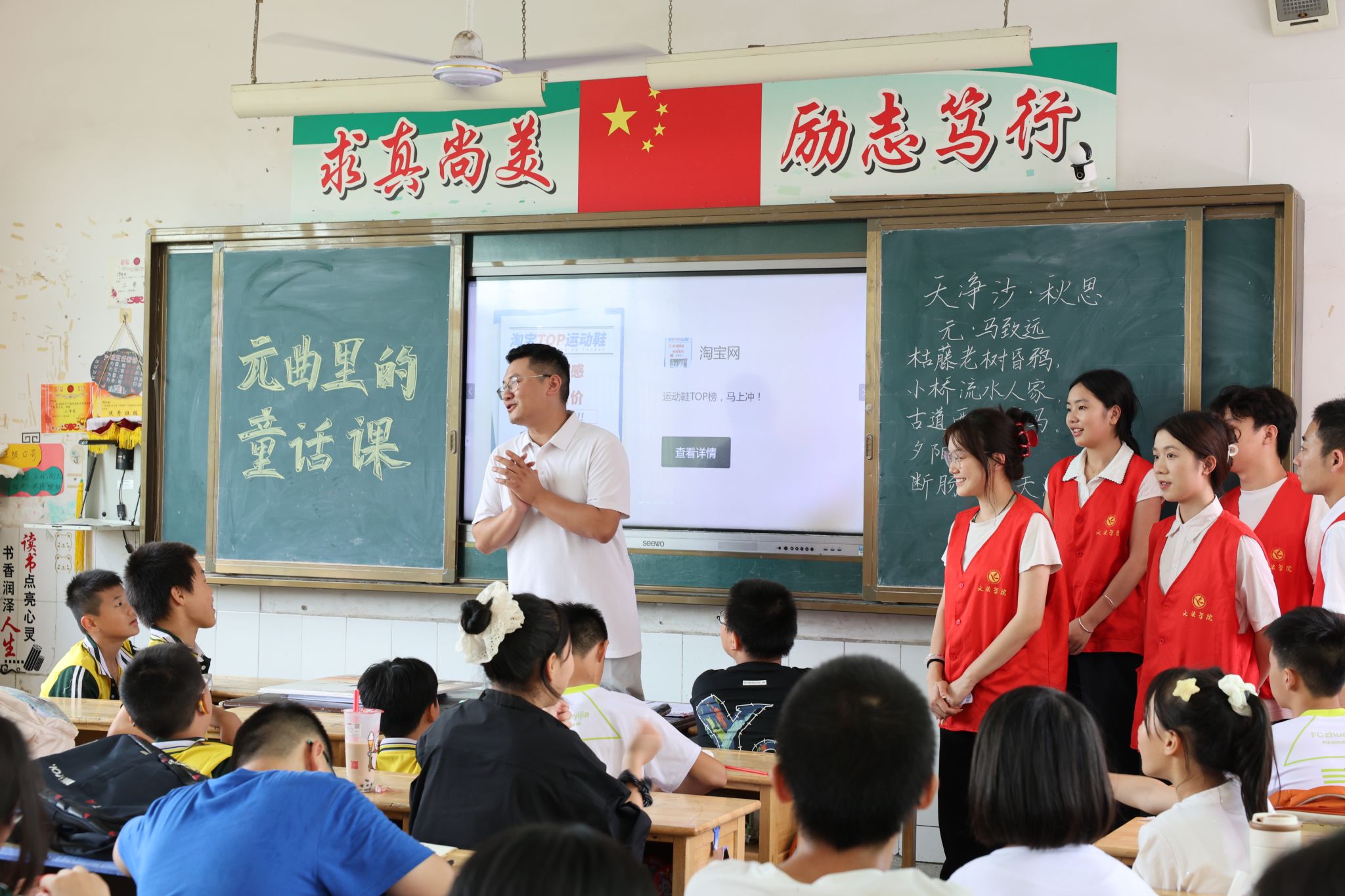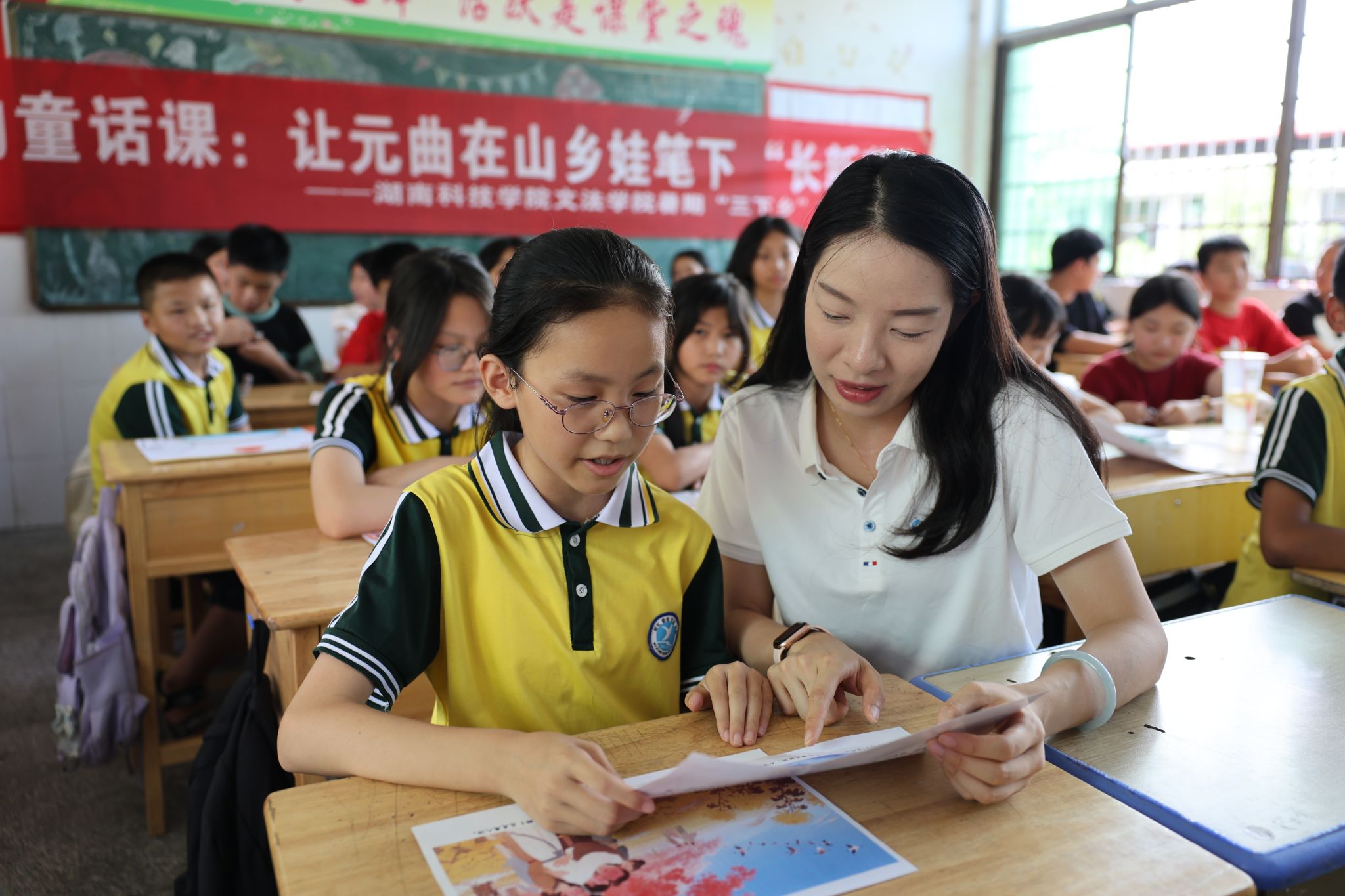 本网讯(通讯员 王艺 张湘赣 向薛峰)“柳丝长,春雨细,花外漏声迢递。”当六年级学生陈小雨用永州方言念出关汉卿《大德歌・春》时,教室里爆发出清脆的笑声——近日,文法学院“三下乡”团队在祁阳市浯溪完全小学打造“元曲里的童话课”,让元曲在山乡娃笔下“长新芽”。