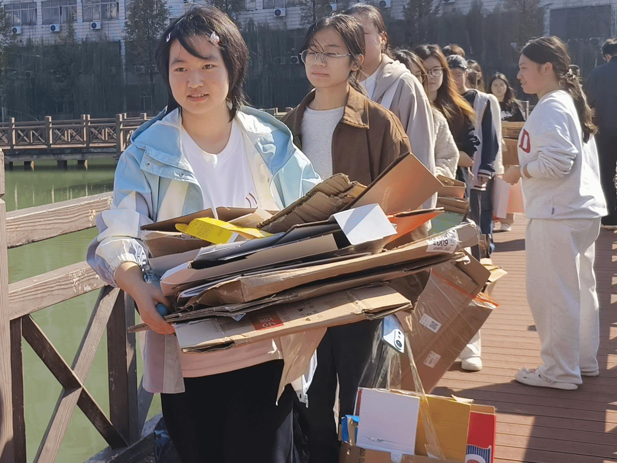 活动吸引全校学生600余人共同参与。同学们抱着、拎着早已压扁捆好的纸箱和塑料瓶,从四面八方涌向南大门科创广场和荷园宿舍区等两个回收点,场面十分热闹。“没想到攒了这么多,清空了宿舍角落,还能为环保做贡献,感觉特别值!”生工2401班刘文轩同学笑着说。